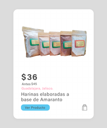 Harinas preparadas a base de Amaranto para elaborar: Panques, Hot Cakes ricos en fibra, Crepas, Malteadas, Hot Cakes libres de gluten, Crema de cacahuate, Crema de cacahuate con cacao y Mix de semillas ricas en calcio.